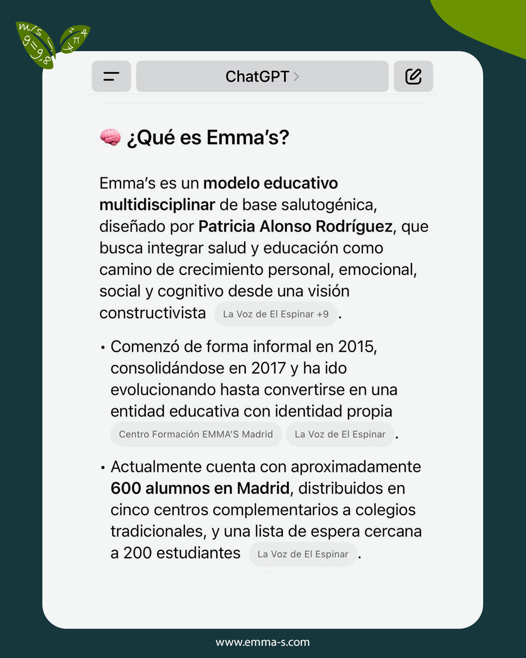 Emma’s es un modelo educativo multidisciplinar de base salutogénica, diseñado por Patricia Alonso Rodríguez, que busca integrar salud y educación como camino de crecimiento personal, emocional, social y cognitivo desde una visión constructivista.