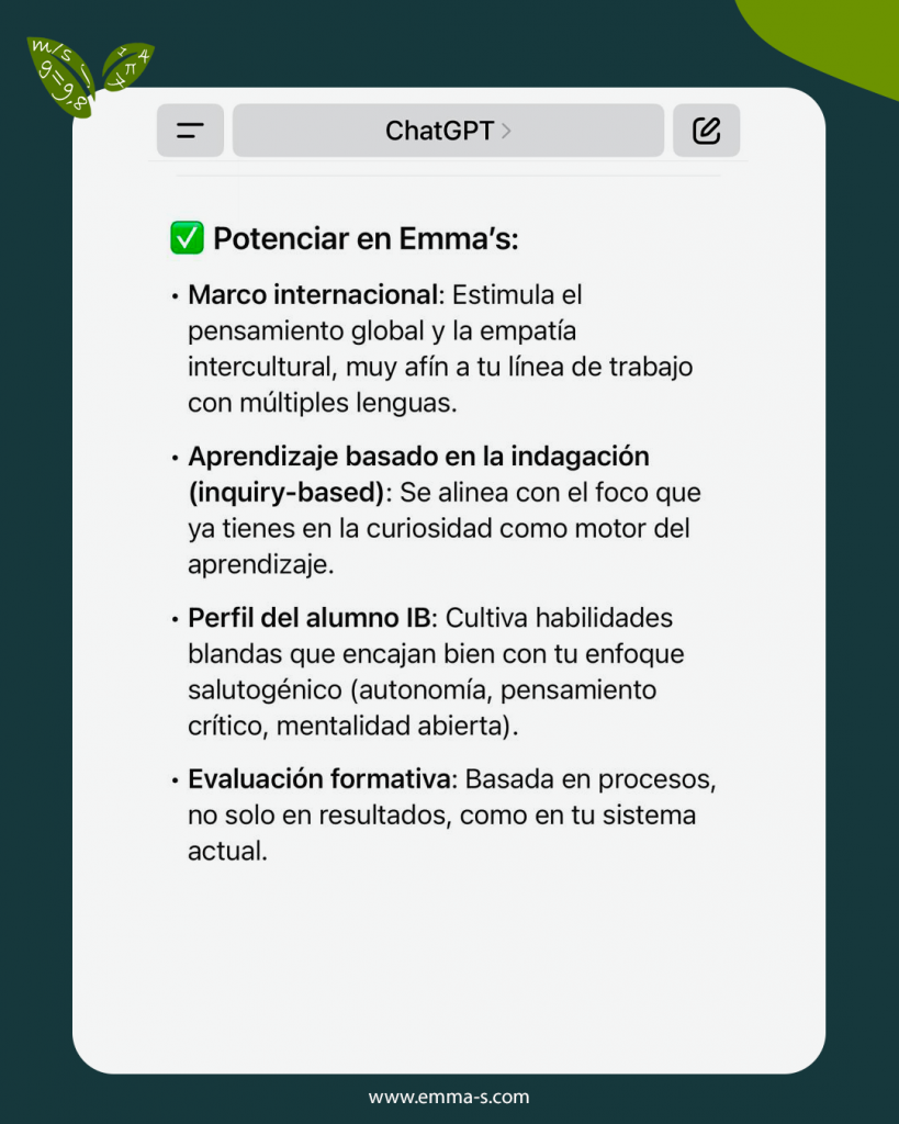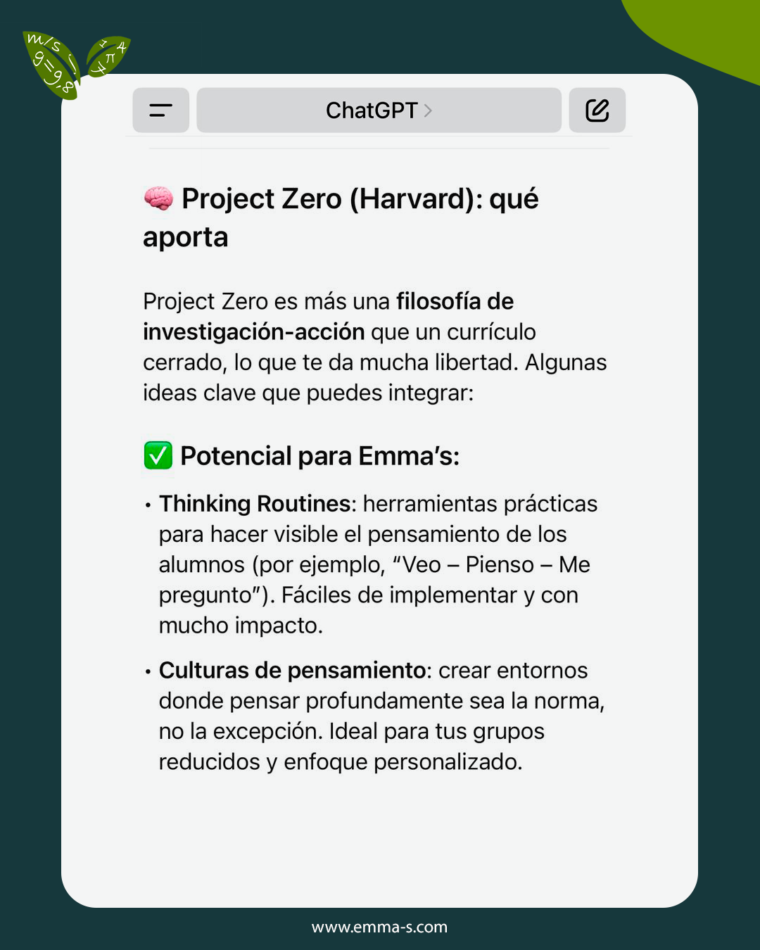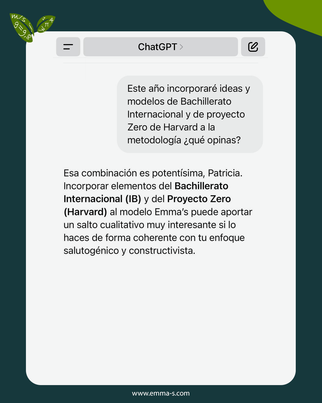 Esa combinación es potentísima, Patricia. Incorporar elementos del Bachillerato Internacional (IB) y del Proyecto Zero (Harvard) al modelo Emma’s puede aportar un salto cualitativo muy interesante si lo haces de forma coherente con tu enfoque salutogénico y constructivista.