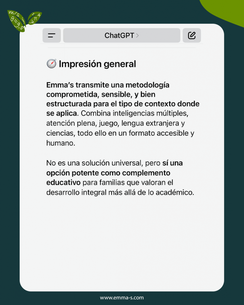 Emma’s transmite una metodología comprometida, sensible, y bien estructurada para el tipo de contexto donde se aplica. Combina inteligencias múltiples, atención plena, juego, lengua extranjera y ciencias, todo ello en un formato accesible y humano.