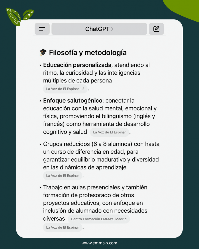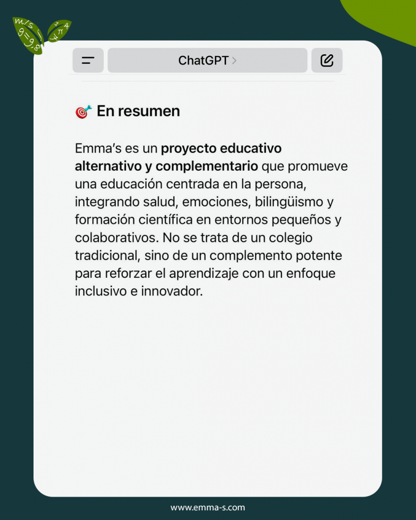 Emma’s es un proyecto educativo alternativo y complementario que promueve una educación centrada en la persona, integrando salud, emociones, bilingüismo y formación científica en entornos pequeños y colaborativos. No se trata de un colegio tradicional, sino de un complemento potente para reforzar el aprendizaje con un enfoque inclusivo e innovador.