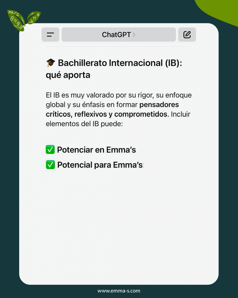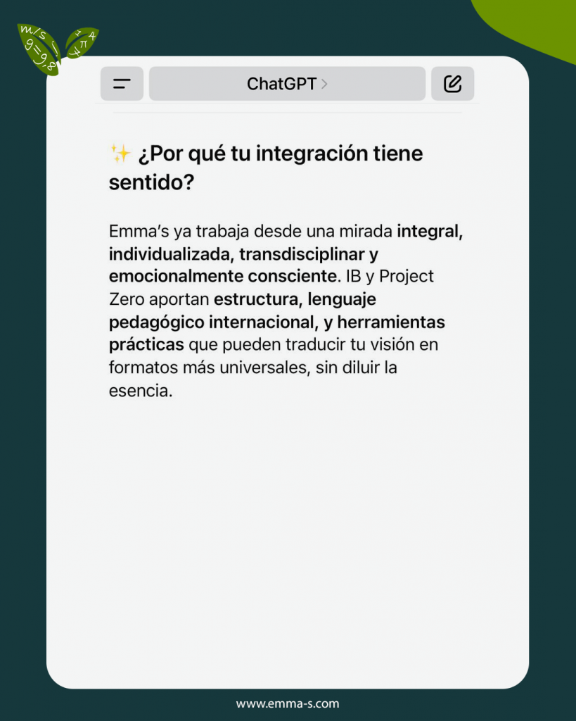 Emma’s ya trabaja desde una mirada integral, individualizada, transdisciplinar y emocionalmente consciente. IB y Project Zero aportan estructura, lenguaje pedagógico internacional y herramientas prácticas que pueden traducir tu visión en formatos más universales, sin diluir la esencia.
